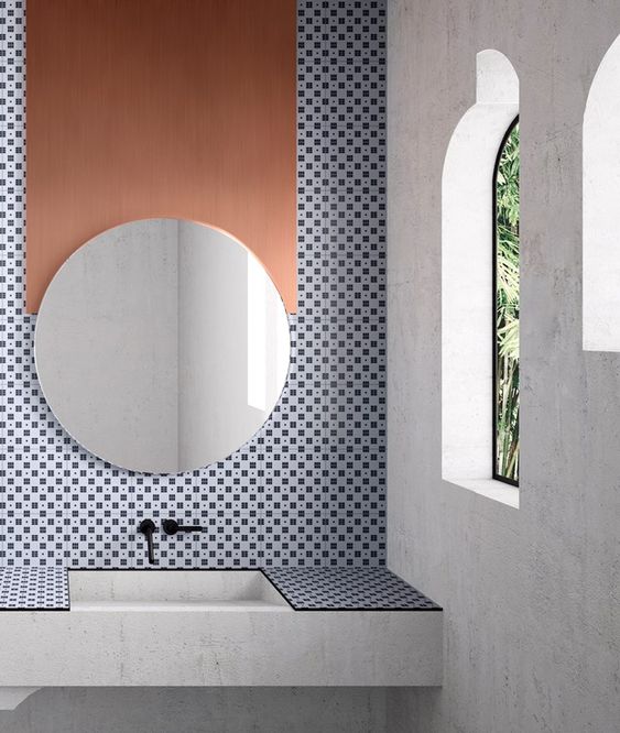 Materiality + Surfaces – Exposed concrete floors and walls, tile, mirror, copper metal, painted plaster, wood, glass.