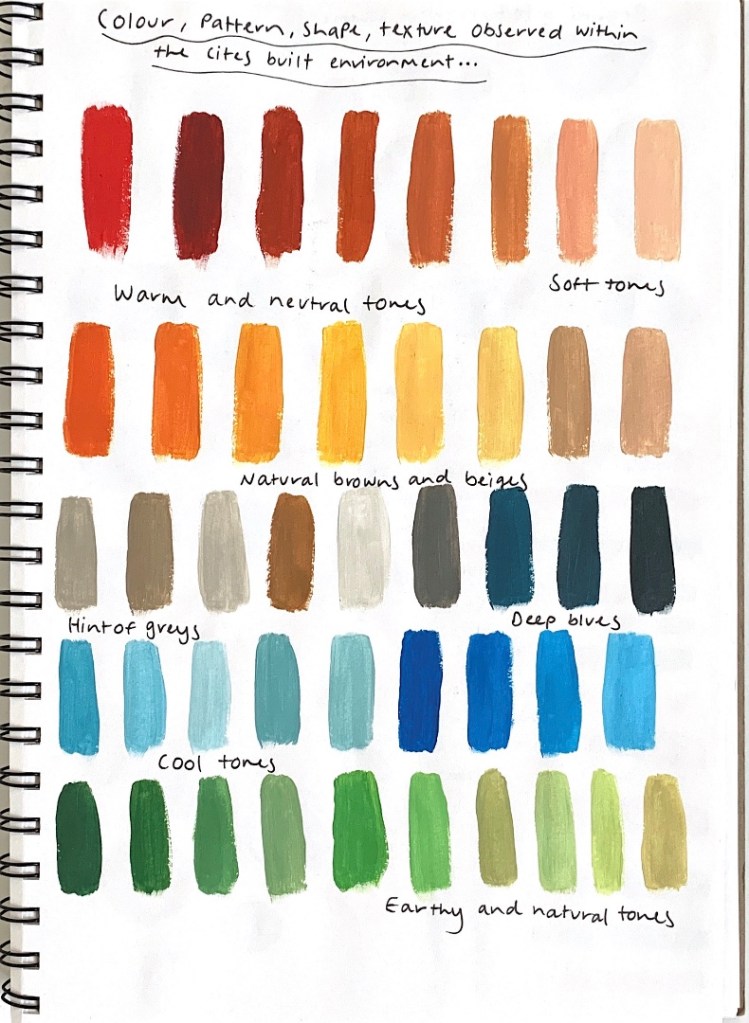 After walking through the city and colour mapping the various patterns, shapes, colours and textures I noticed, I began to generate colour schemes, exploring the array of colours present within the cites built environment. I wanted to establish an overall colour palette that references to a vast range of colours, in order for me to start grouping together selective colours that could be employed within my design.