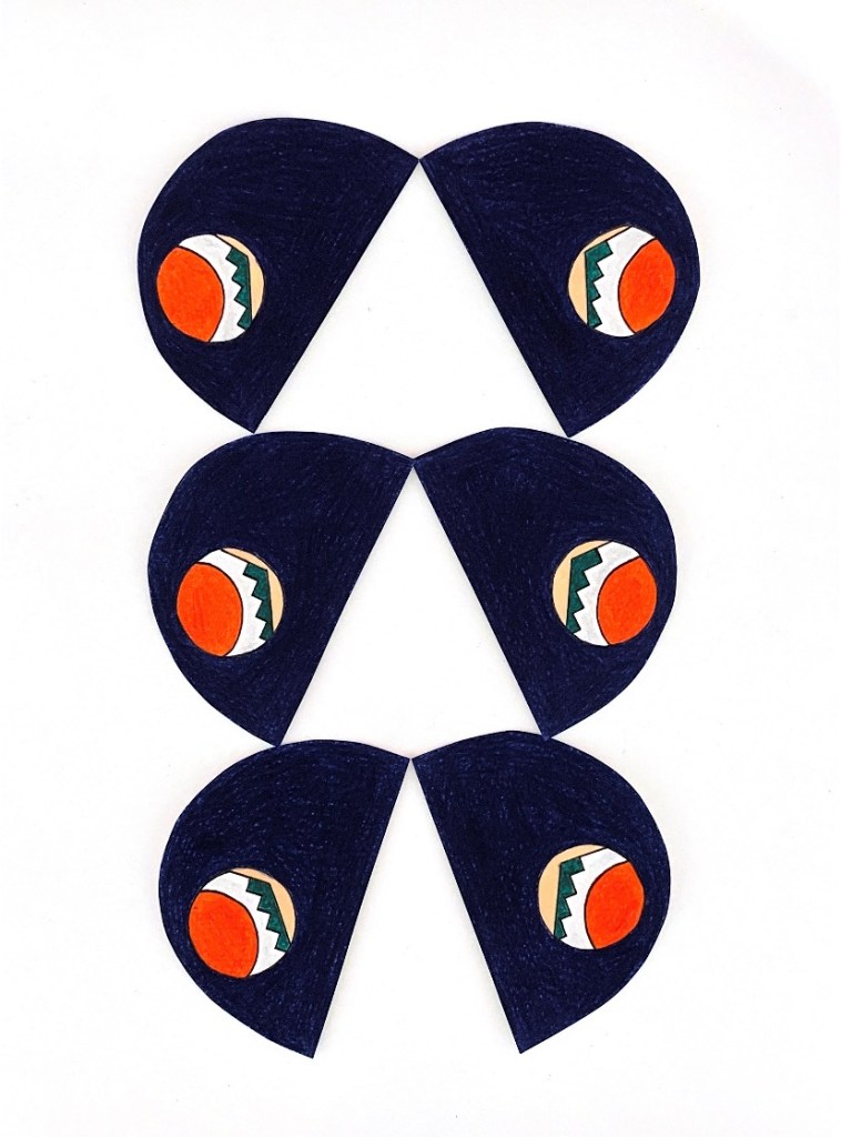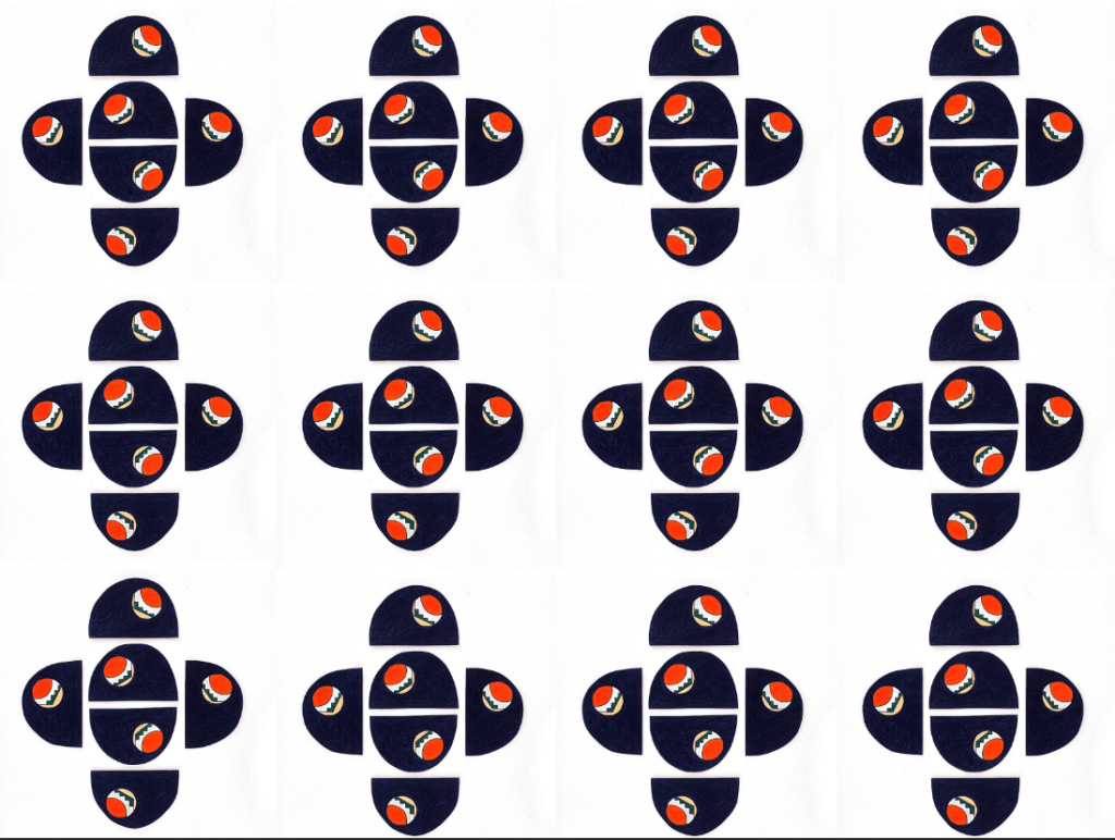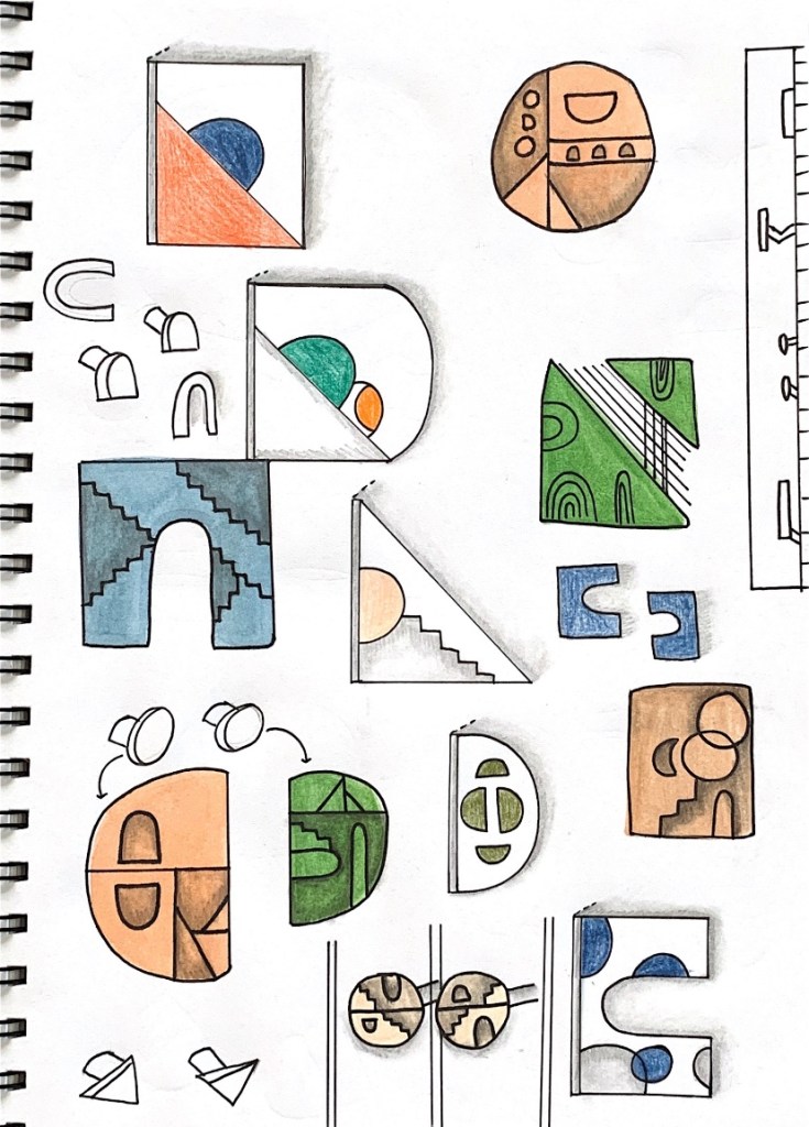 Using my shape design, I started experimental testing of differential pattern ideas by laying out the shape in various compositions imagining how these designs would emulate in a repeated tile design.