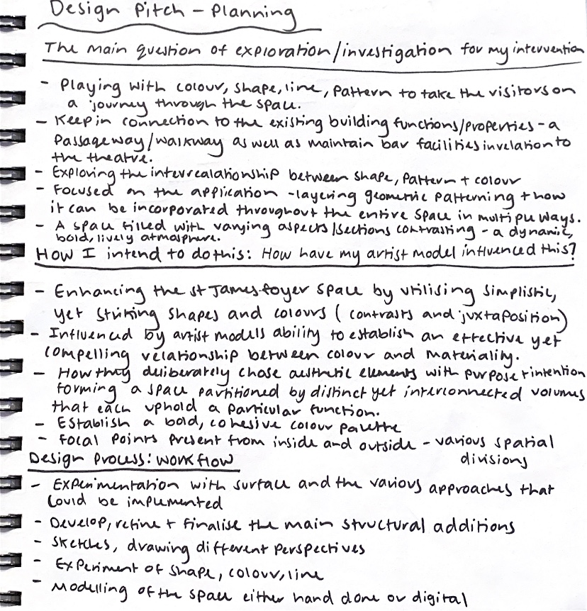 My desired design intervention will explore the interrelationship between characterised geometric shapes, pattern and colour, and how each element coherently functions within the space. I wish to enhance the St James foyer space by utilising simplistic, yet striking shapes and colours that contrast and juxtapose against each other, creating a dynamic, bold and lively atmosphere. Focusing on the application and use of layered, geometric patterning and how it can be incorporated throughout the entirety of the space but in a multitude of ways.