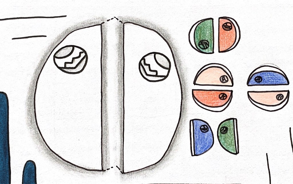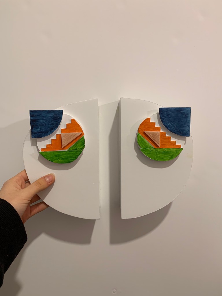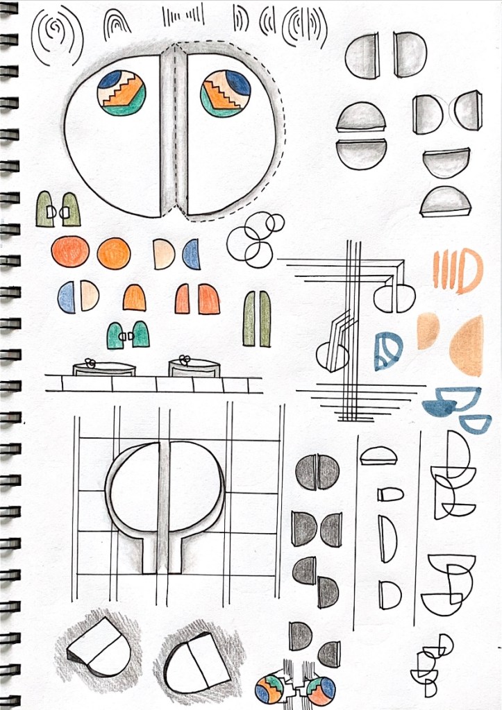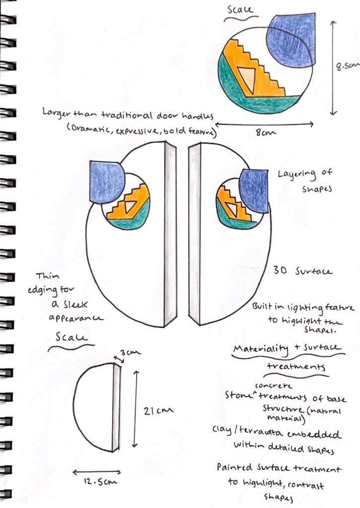 For the final design I chose to utilise two half circles, both which extend out from the wall to create the appearance of a whole circle. Each half features a detailed composition of layered, geometric shapes, each built from differential colours and materials, particularly ones reflective within the foyer space. The base and half circles are constructed of an exposed concrete finish, with the coloured shapes highlighting both painted surfaces and textured materiality, in order to make it all cohesive to the materials used in the internal space. The size of the door handles extend slightly larger than the average door handle in order to heighten its presence, impact and truely capture the attention of people proceeding past. This design is bold, vibrant and detailed, yet minimal and sleek at the same time where each curve, line and angle is purposeful and dominant.