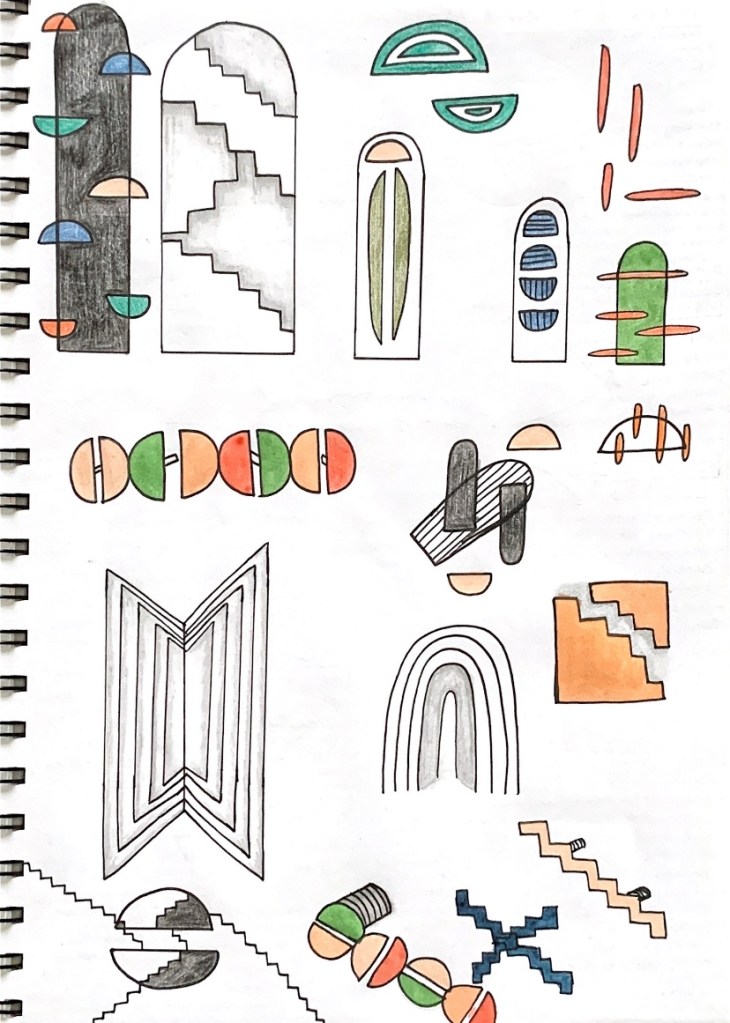 Beginning my pattern design, I started by exploring and sketching out an array of shapes and geometric forms influenced by both my artist model’s work and shapes I observed through my own design explorations, as well as the external environments of our surrounding city. Experimenting with colour, shapes, pattern and how I could combine, layer, merge, juxtapose these aspects together to formulate a desired shape and pattern for further testing.