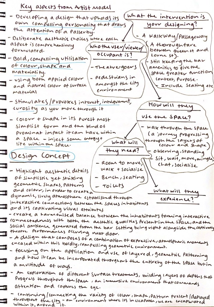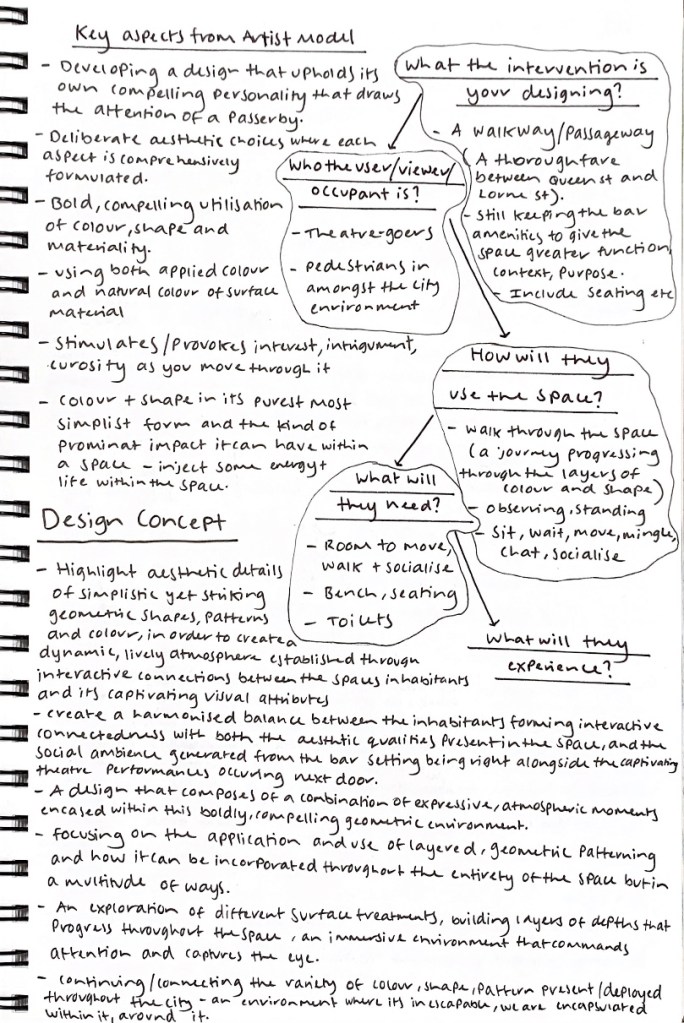 I decided to brainstorm and map out what exactly my design intervention will entail, its main components and overall function and purpose. I also wrote down key influential aspects from my artist model and their work, as well as beginning to establish my conceptual ideas, thinking about what exactly is conceptually driving my design intervention, the experience I am wanting to create and how will my creative approach reflect this.
