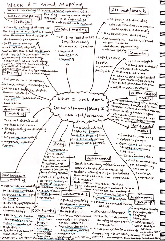 I started to mind map everything I have done over the last eight weeks as part of this design development process. Below each jotted exercise and activity I wrote down the key elements, concepts, ideas and discoveries made within each creative experiment. I noticed that there were a lot of reoccurring themes and connecting ideas between the different explorational activities, all of which I wish to utilise and continue progressing with in my design moving forwards.