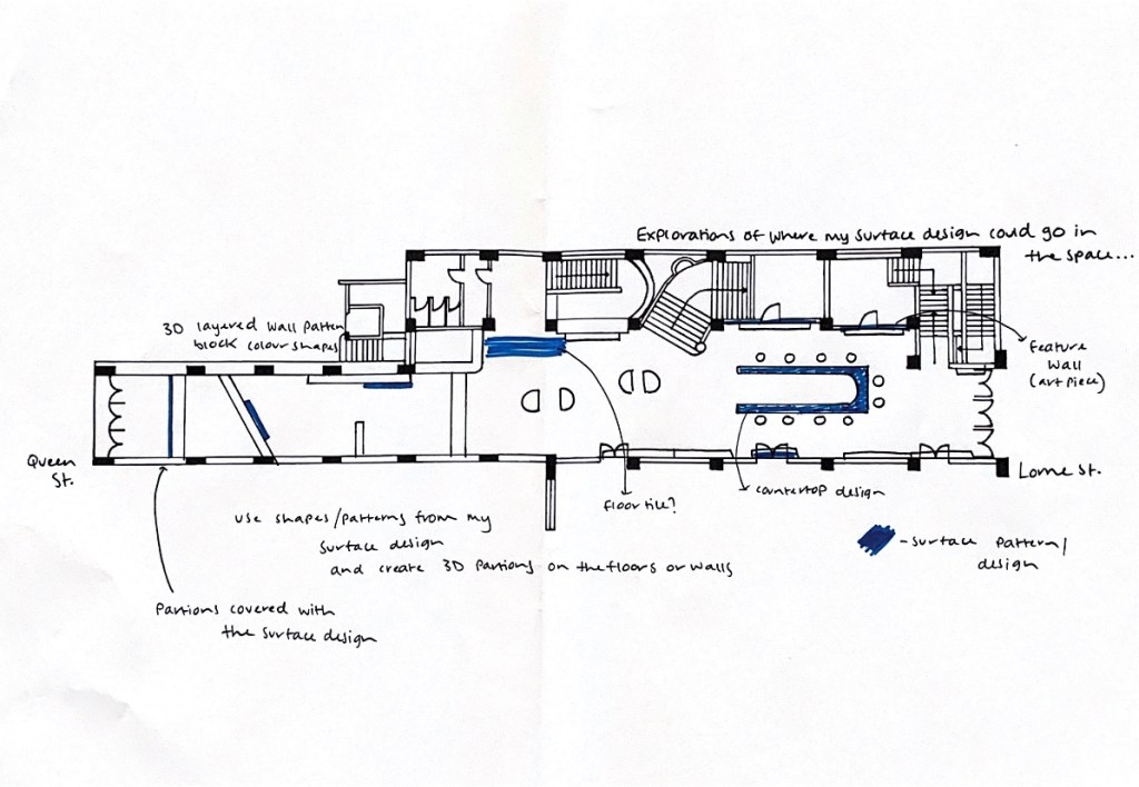 Once I had established my new surface design I began sketching out the various ways in which it could be implemented into my design intervention, how it can be showcased and with what particular approach. Considering if I want it to be manifested as a surface design or even convert aspects into a three dimensional form. Considering size and scale and if it will be one focal aspect or included within multiple locations of the space as a repetitive design element.
