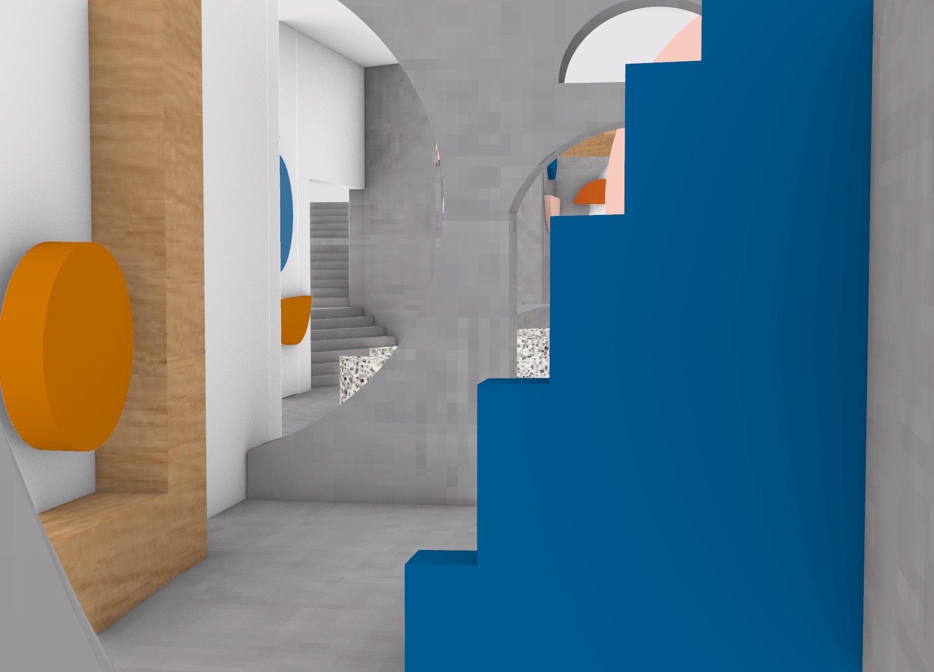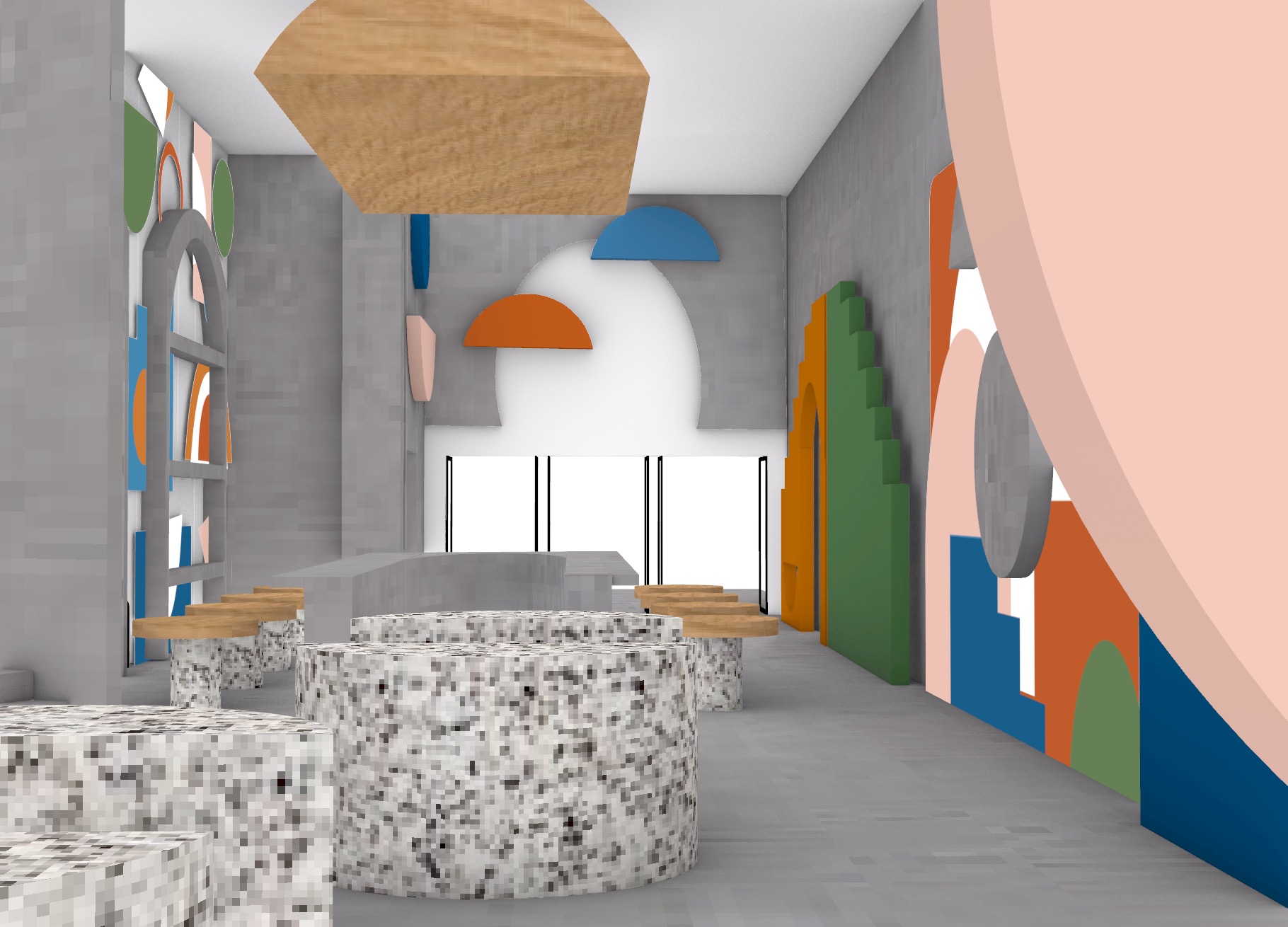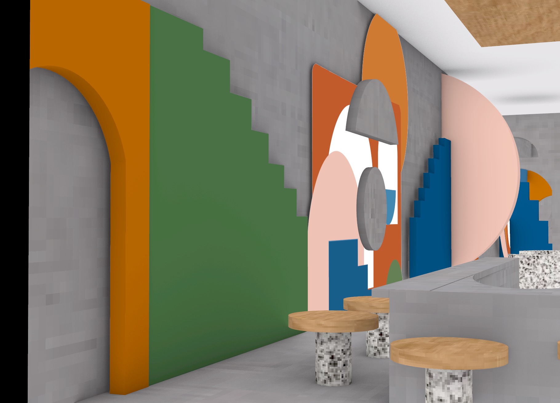 For my other coloured partitions and walls present within my design intervention, as well as some of the main existing walls, I would utilise a simple, lightly textured plaster finish, one that highlights the bold, striking colours that would be painted on top. I also wanted to employ aspects of wood into my design, in order to enhance the overall space and make it more inviting, provoking feelings of warmth and comfort particularly when in the communal bar setting. I integrated wood features into a couple geometric wall mounted partitions, the bar stools as well as the archway feature that sits directly above the bar countertop. In order to further enhance the space I really wanted to try utilise the incorporation of a statement terrazzo stone as I believe it would add a whole another depth and layer to my entire design intervention. Using a material that would pick up on the various bold colours and tones present in the space tying it all together. I would subtly yet purposefully include the terrazzo stone into the base of the bar stools and as the free standing bench counters present in the centre of the space.