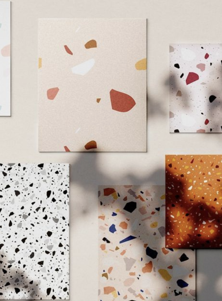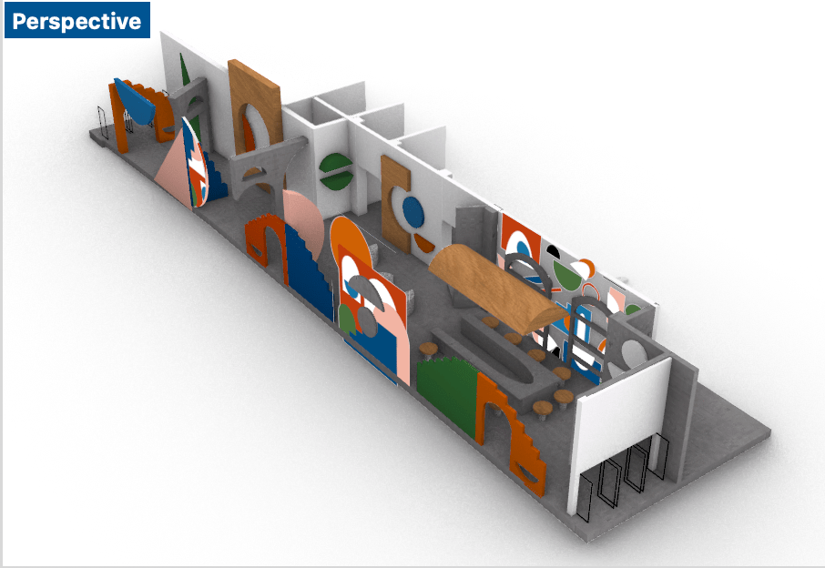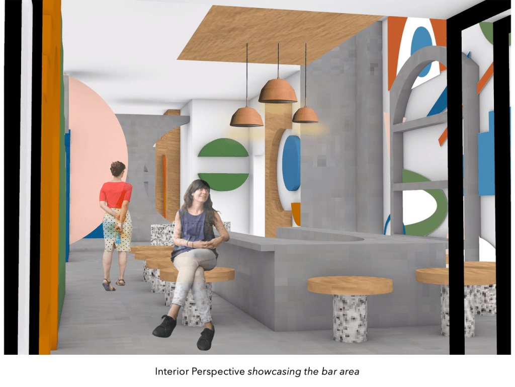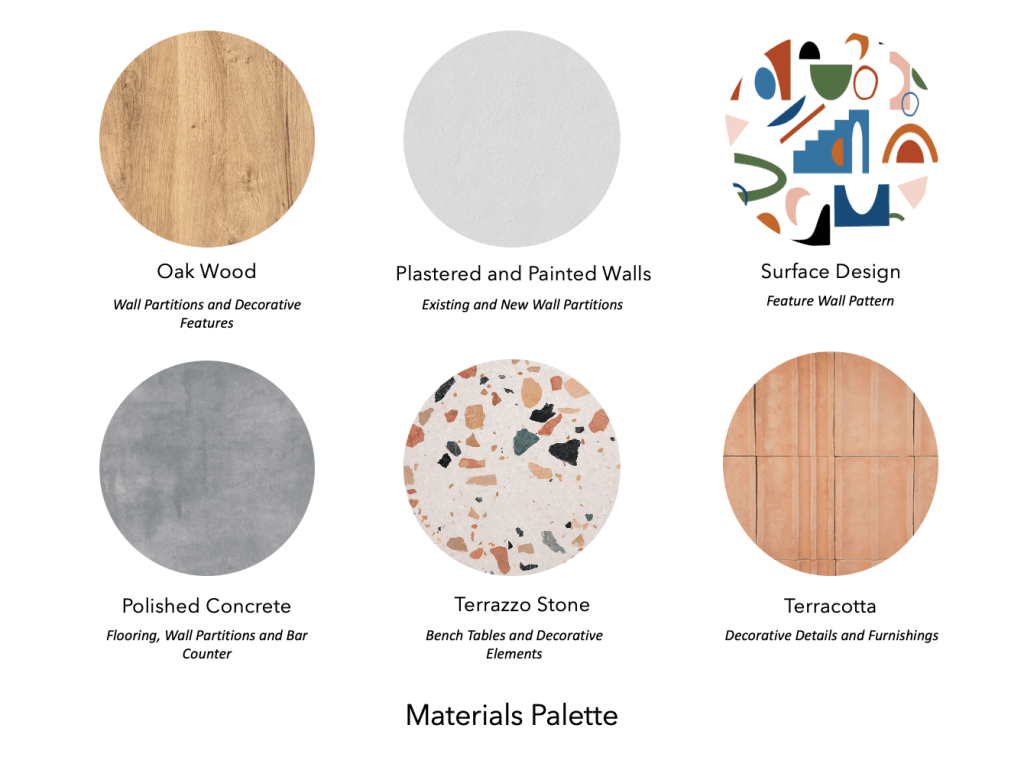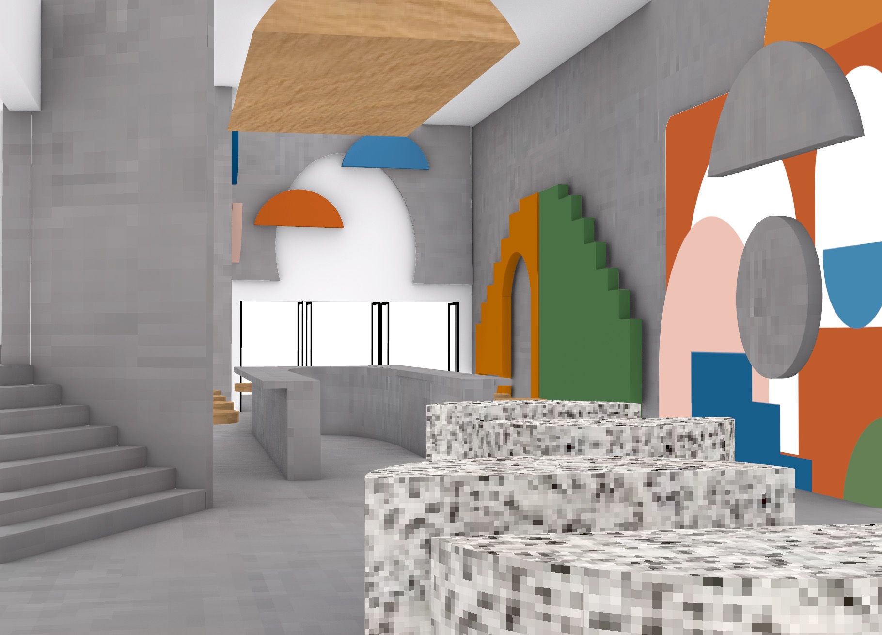For my other coloured partitions and walls present within my design intervention, as well as some of the main existing walls, I would utilise a simple, lightly textured plaster finish, one that highlights the bold, striking colours that would be painted on top. I also wanted to employ aspects of wood into my design, in order to enhance the overall space and make it more inviting, provoking feelings of warmth and comfort particularly when in the communal bar setting. I integrated wood features into a couple geometric wall mounted partitions, the bar stools as well as the archway feature that sits directly above the bar countertop. In order to further enhance the space I really wanted to try utilise the incorporation of a statement terrazzo stone as I believe it would add a whole another depth and layer to my entire design intervention. Using a material that would pick up on the various bold colours and tones present in the space tying it all together. I would subtly yet purposefully include the terrazzo stone into the base of the bar stools and as the free standing bench counters present in the centre of the space.