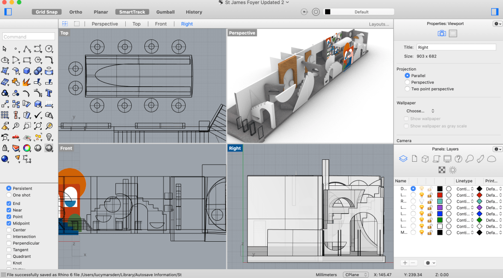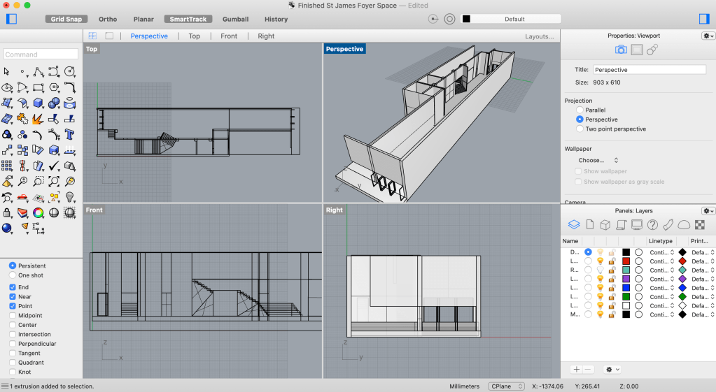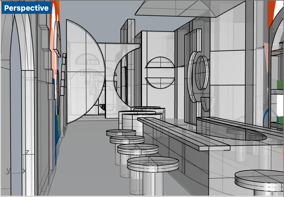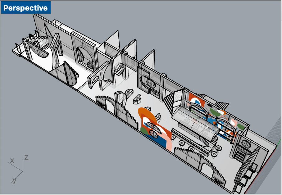 This week I also began the development of my Digital Rhino model that will portray the perspective views of my overall design intervention in the St James Theatre foyer. I decided to create a digital model of the space as I believe it will best articulate and showcase my design intervention and the kind of impact I am wanting it to have. It will also help me gather a better understanding of perspective, as by having a three dimensional representation of the space to work with, I will be able to better see and understand how my design could be implemented into the space and through what specific aspects.
