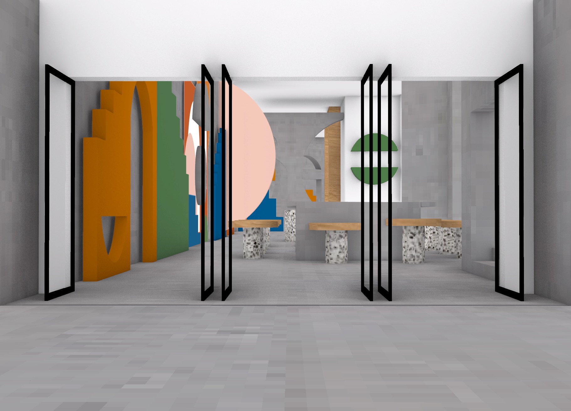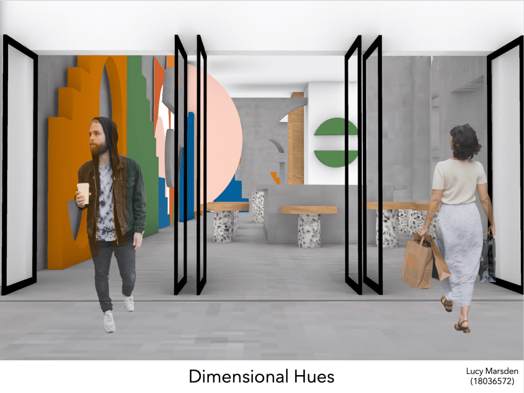 ‘Dimensional Hues’ explores the interrelationship between characterised geometric shapes, colours and patterning details, where they are embodied throughout the entirety of the space but in a multitude of ways. Developing an exploration of diverse colours and surface treatments, in order to build up layered, volumetric forms that comprehensively wrap around the entire space. An immersive experience where the inhabitant becomes a part of the design, where they are encompassed by these juxtaposed partitions, forming a vibrant, eye catching atmosphere that commands their attention. My design utilises aesthetic features of simplistic yet striking shapes, colours and patterns that are coherently layered and contrasted against each other. Establishing a dynamic, lively atmosphere generated through interactive connections between the spaces inhabitants and its captivating visual attributes. A design that composes of a combination of expressive, atmospheric moments encased within this boldly, compelling geometric environment.