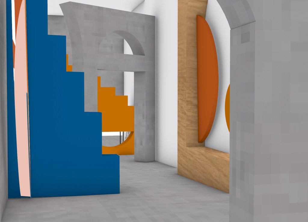 For my first model I decided to play around with the main, dominant colours, various shapes and volumes present within Renesa’s work. Exploring how these distinctive forms and volumes could overlap, layer and interconnect with each other.